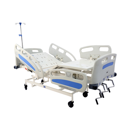 Over all dimension – 2320x1150, Max height -840mm, Min height – 570mm, Four section top CRCA sheet with long perforation with extra extrusion, height adjustments, back rest knee rest, trendelenburg & Res tr, operated by 4 separate screw lever mechanism, removable polymers head and foot boards, four sided wall protector, split type polymer railings (4 pieces), two way saline telescopic rod, with four location I.V holes, castor wheels 125mm 4pcs (2 with break),urine bag holder, pre treated and epoxy powder coated 50 to 60 microns.