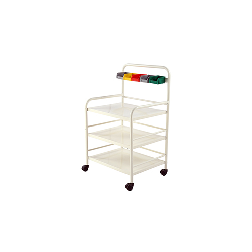 EMERGENCY TROLLEY Over all dimensions – 690x450x900/1250mm(H) 6 colour medicine bins, 3 shelf with 3 way side railing with 75mm wheels 4 nos (2 with brakes), pre treated and epoxy powder coated.
