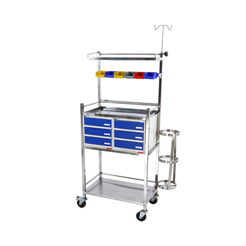 Over all dimensions 690x385x1080/1700mm(H) 6 Alcon polymer drawers with 6 colour medicine bins, overall stainless steel 2 shelf with side railing, monitor stand with I.V rod with O2 holder, wooden pad, cardiac message pad hook with 100mm wheels 4 piece (2 with brake), complete stainless steel.