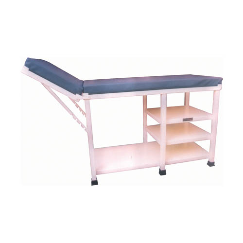 EXAMINATION TABLE. Over all dimensions – 1830x610x812mm(H) Head up / Head low attachment with mattress, one half shelf & complete base shelf, epoxy powder coated, rubber bush in legs.